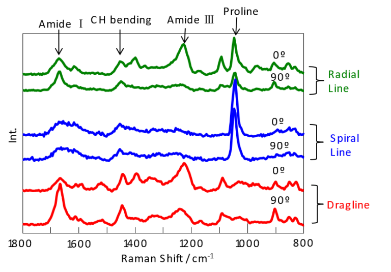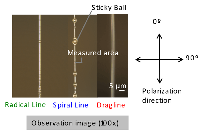 對直徑為幾微米(μm)的三種蜘蛛絲(拉線、放射線和螺旋線)進行拉曼光譜測量,這些蜘蛛絲源自Oriental golden orb web spider(直譯為” 東方金球網蜘蛛”) 裡的 Nephila clavate(橫帶人面蜘蛛)。透過旋轉蜘蛛絲,使雷射光源的偏振方向可以與纖維軸平行(0°)或是正交(90°)。(拉曼測量條件,Ex:532 nm,光柵:600 lines/mm,物鏡倍率:100x)