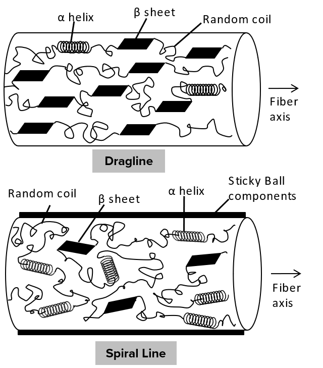 螺旋線(用於捕捉獵物)具有低方向性,包含許多α螺旋和無規則缐圈(Random coil) 結構。這被認為與螺旋線纖維的延展性和彈性特性有關(如圖4)。此外,螺旋線纖維的光譜顯示,其表面具有富含脯氨酸(proline)的黏性成分。