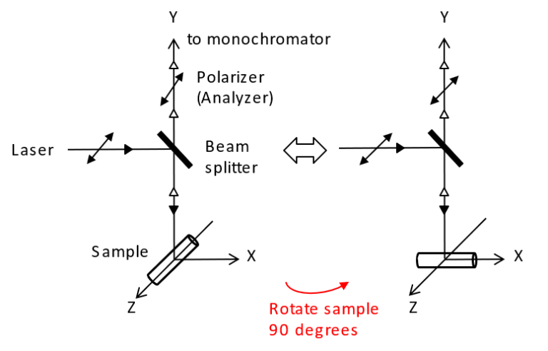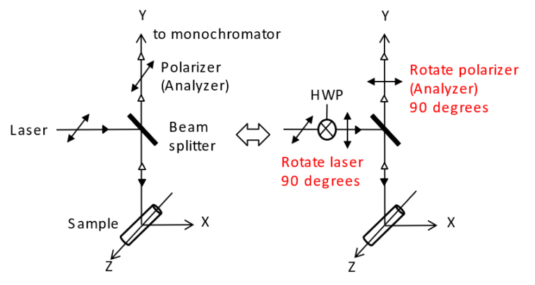 使用半波片 (Half-wave plate,HWP) 將雷射光束的偏振面旋轉 90 度。同時,拉曼光路側的偏光片(Analyzer)也旋轉90度。