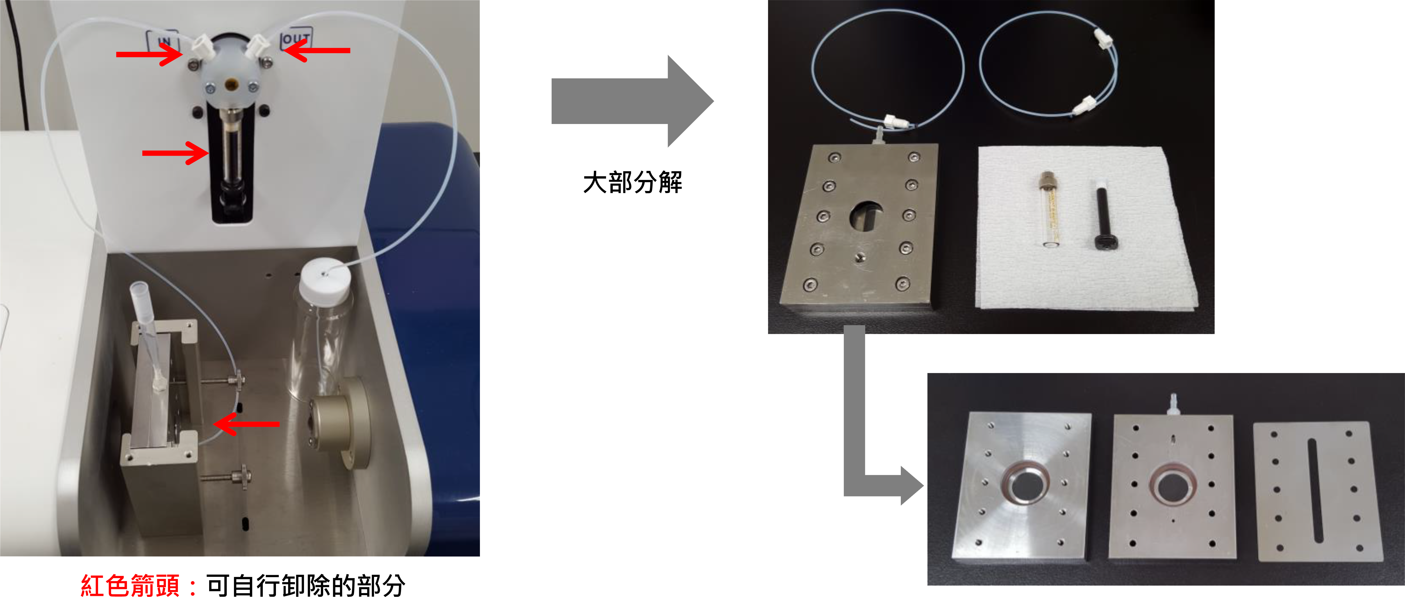 (2) 簡單維護:注射式幫浦(Syringe pump)和流動液槽(Flow cell)都可以方便地拆卸,讓清洗變得容易。