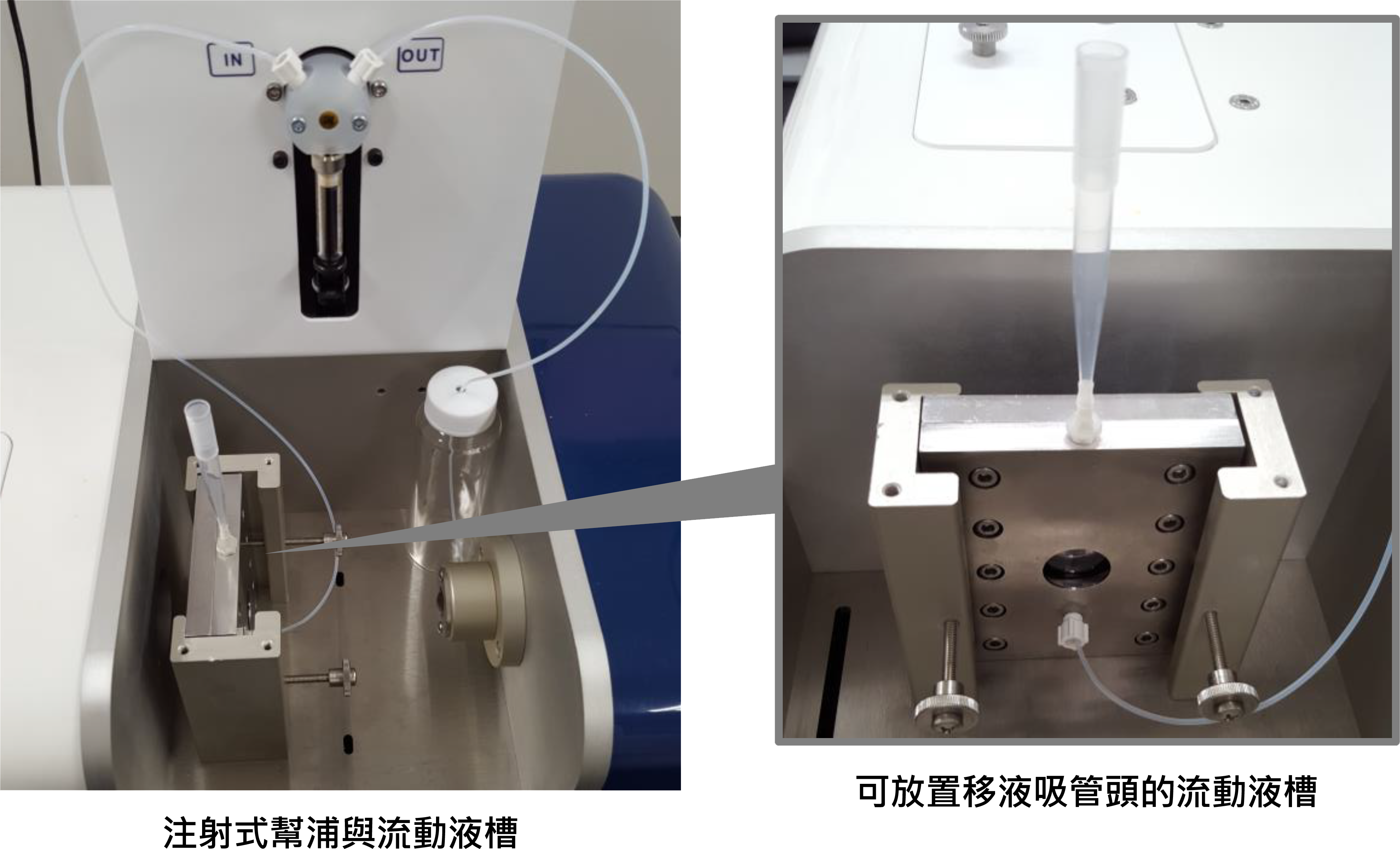 (1) 微小樣品量:該儀器採用注射式幫浦(Syringe pump)與可放置移液吸管頭(Pipet tip)的流動液槽(Flow cell),